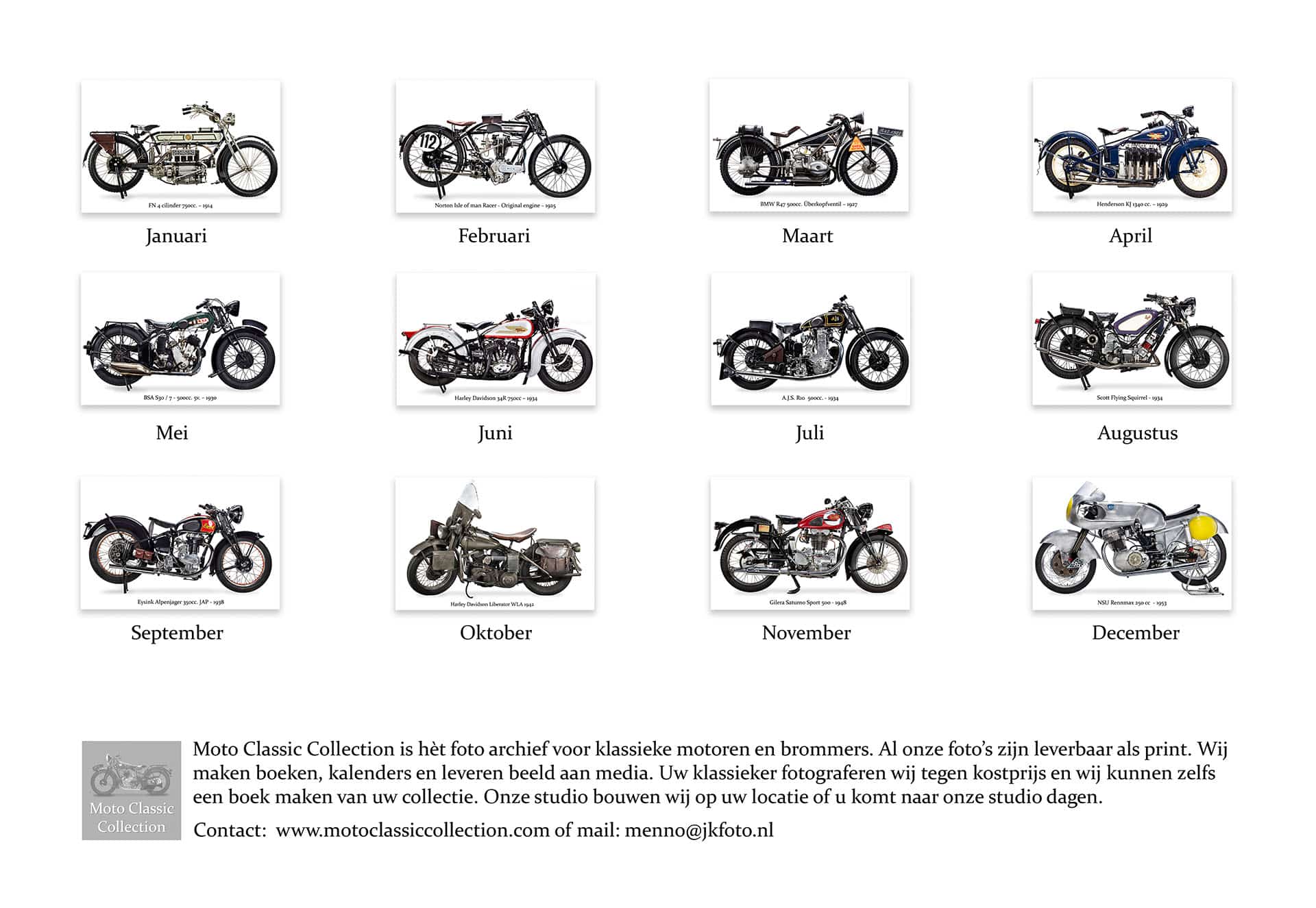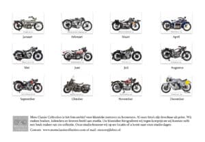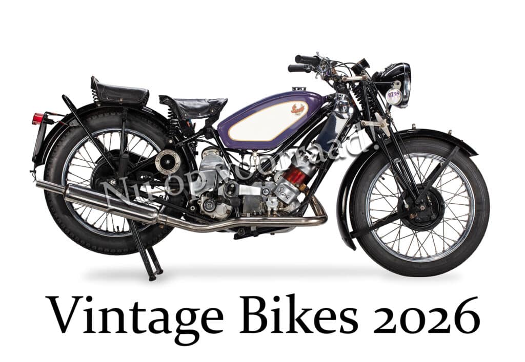 Vintage Bikes kalender 2026 op formaat A3 – dat is 42 x 29.7 centimeter – 12 vooroorlogse motoren uit de periode van ongeveer 1920 tot en met 1940 van januari tot en met december.