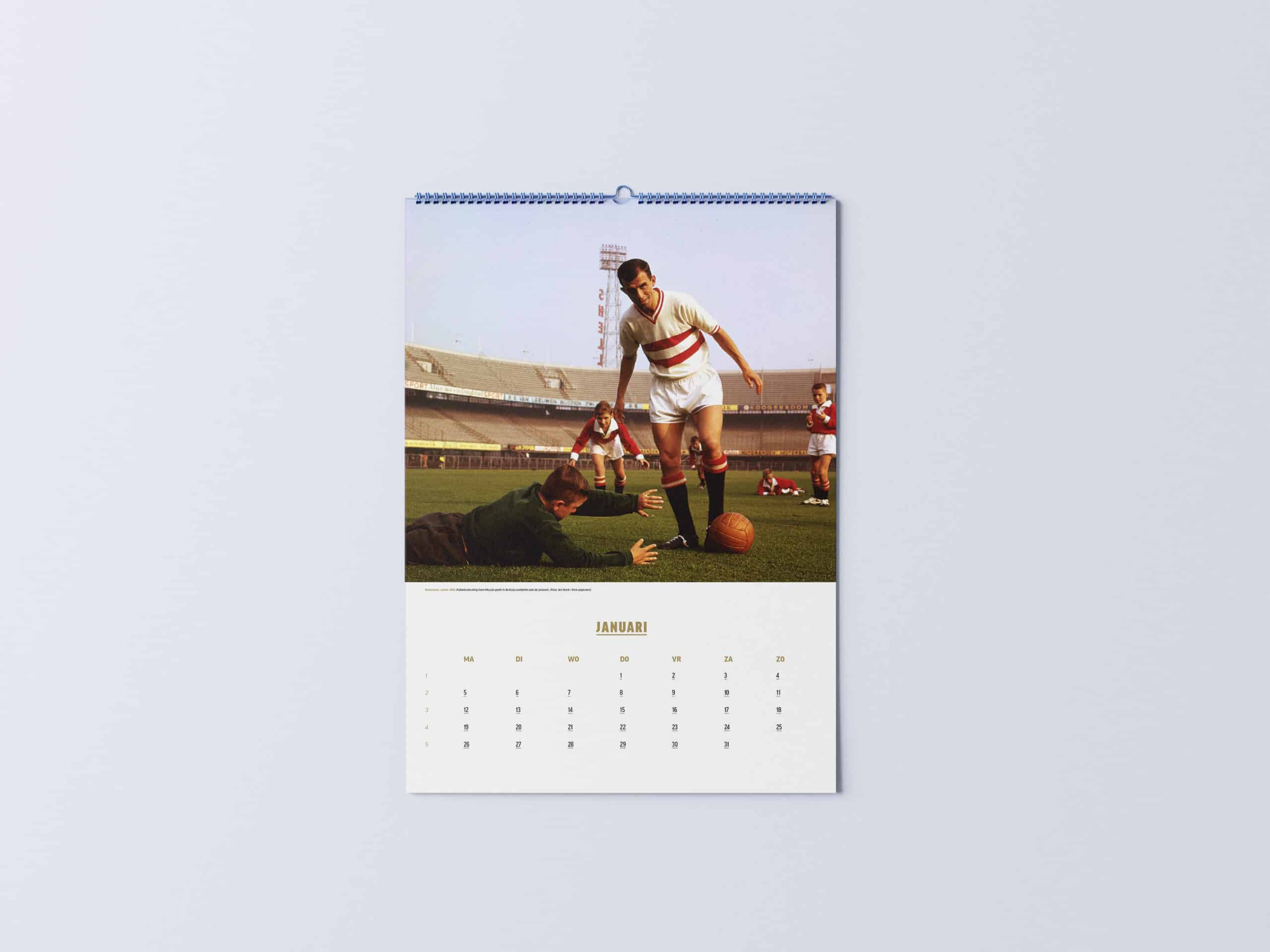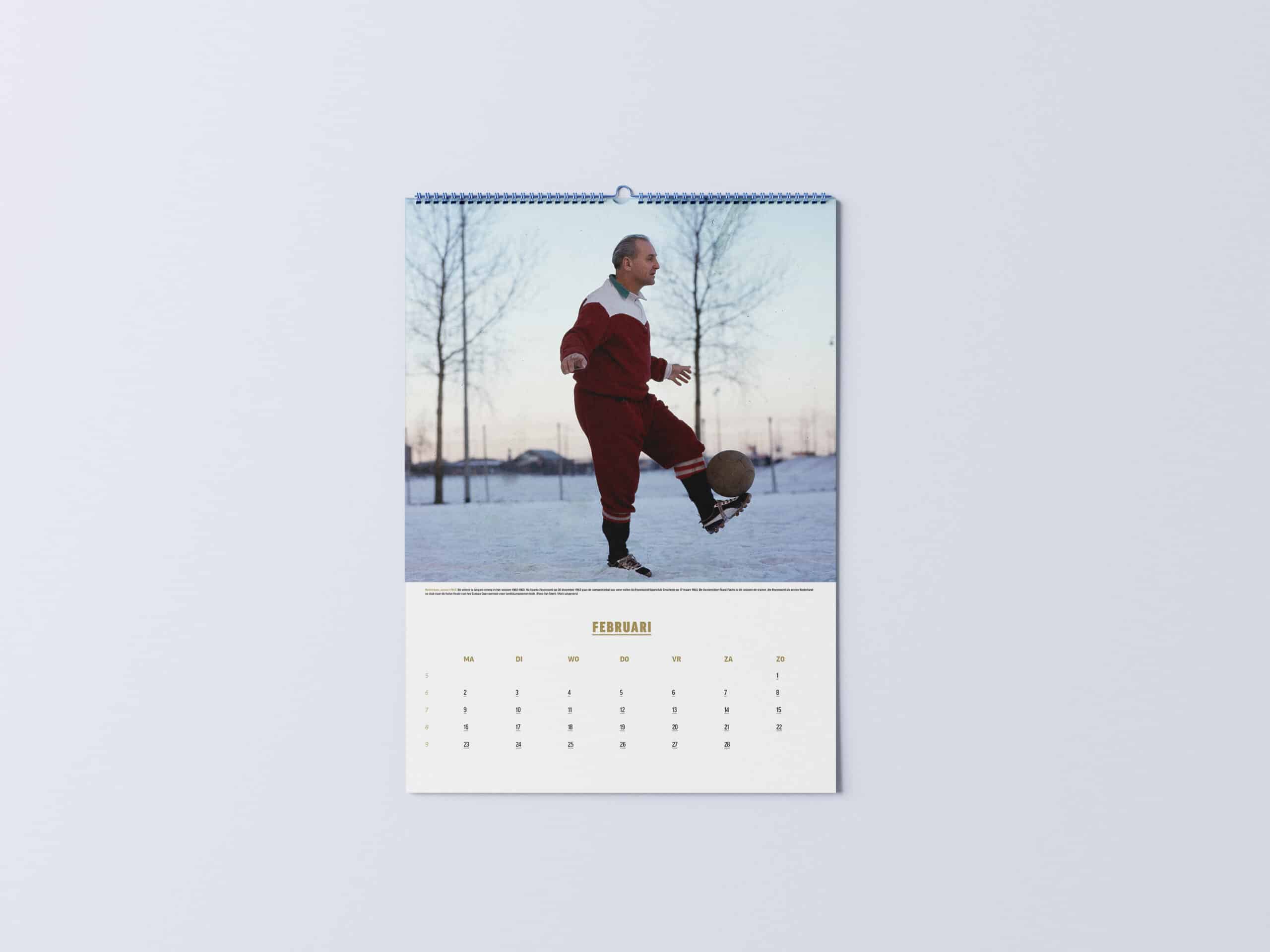 Er is nog veel meer te zien in deze unieke kalender. We zien publiekslieveling Coen Moulijn die in De Kuip de junioren voetballes geeft. En we zien de Oostenrijker Franz Fuchs. Als trainer leidde hij tijdens de strenge winter van 1963 Feyenoord als eerste Nederlandse club naar de halve finale van het Europa Cup-toernooi voor landskampioenen.