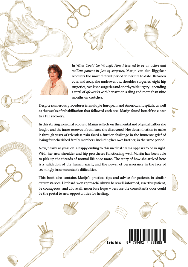 In What Could Go Wrong?: How I learned to be an active and resilient patient in just 25 surgeries, Marijn van den Biggelaar recounts the most difficult period in her life to date. Between 2014 and 2023, she underwent 14 shoulder surgeries, eight hip surgeries, two knee surgeries and one thyroid surgery – spending a total of 96 weeks with her arm in a sling and more than nine months on crutches.